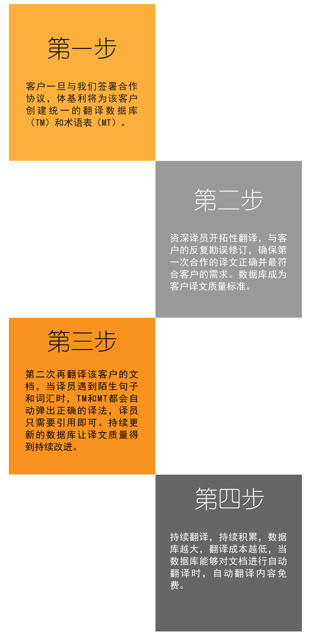客戶一旦與我們簽署合作協(xié)議,體基利將為該客戶創(chuàng)建統(tǒng)一的翻譯數(shù)據(jù)庫(TM)和術語表(MT)。